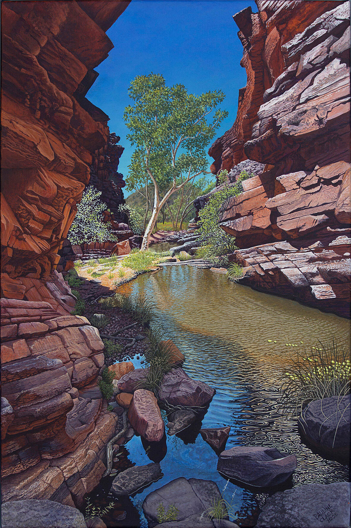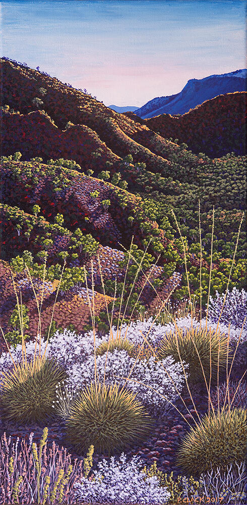 Painting has since become my favourite pursuit when I am not working on graphic design or sewing projects. I like to paint places that are a bit different, small snapshots bathed in special light and colour. My connection to this place is expressed in my work – the ancient land, the colour, the contrasts of severity and softness, strength and fragility that are experienced here.
